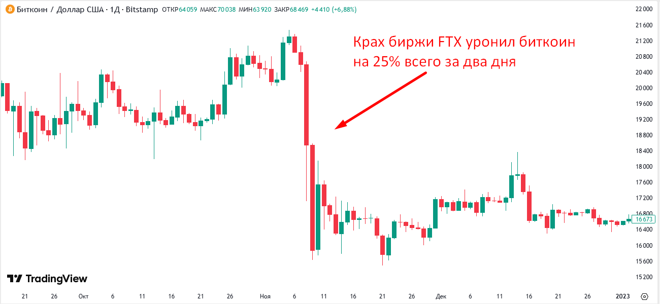 Посмотрите, как отразился крах биржи на самой ликвидной монете - биткоине. Несмотря на то, что падение в целом укладывалось в цикл, оно получило значительное ускорение на таком негативном фоне. Клиенты биржи в таком случае могут рассчитывать на совсем небольшую компенсацию. Также стоит отметить, что потеря доступа к кошельку или скомпрометированные ключи означают фактическую утрату средств. Поэтому для защиты капитала важно использовать аппаратные кошельки, многофакторную аутентификацию и хранить значительные объемы активов вне бирж.