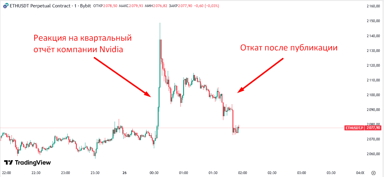 Это делает рынок цифровых активов гораздо более эмоциональным. В отличие от акций, где фундаментальные данные формируют устойчивые тренды, криптовалюты живут в условиях постоянного дисбаланса ожиданий, слухов и манипуляций ликвидностью. В результате их движение чаще отражает психологию толпы, чем экономические показатели. Можно сказать так: если акции считаются инструментом участия в экономике, то крипта скорее представляет собой арену поведения капитала в его чистом виде. В этом случае цена становится просто функцией восприятия и эмоций. Типичный пример выше на картинке – эфириум отреагировал ростом на выход отчёта компании Nvidia. Это просто эмоциональный всплеск, так как эта криптовалюта после перехода на PoS не имеет никакой связи с производителем чипов.