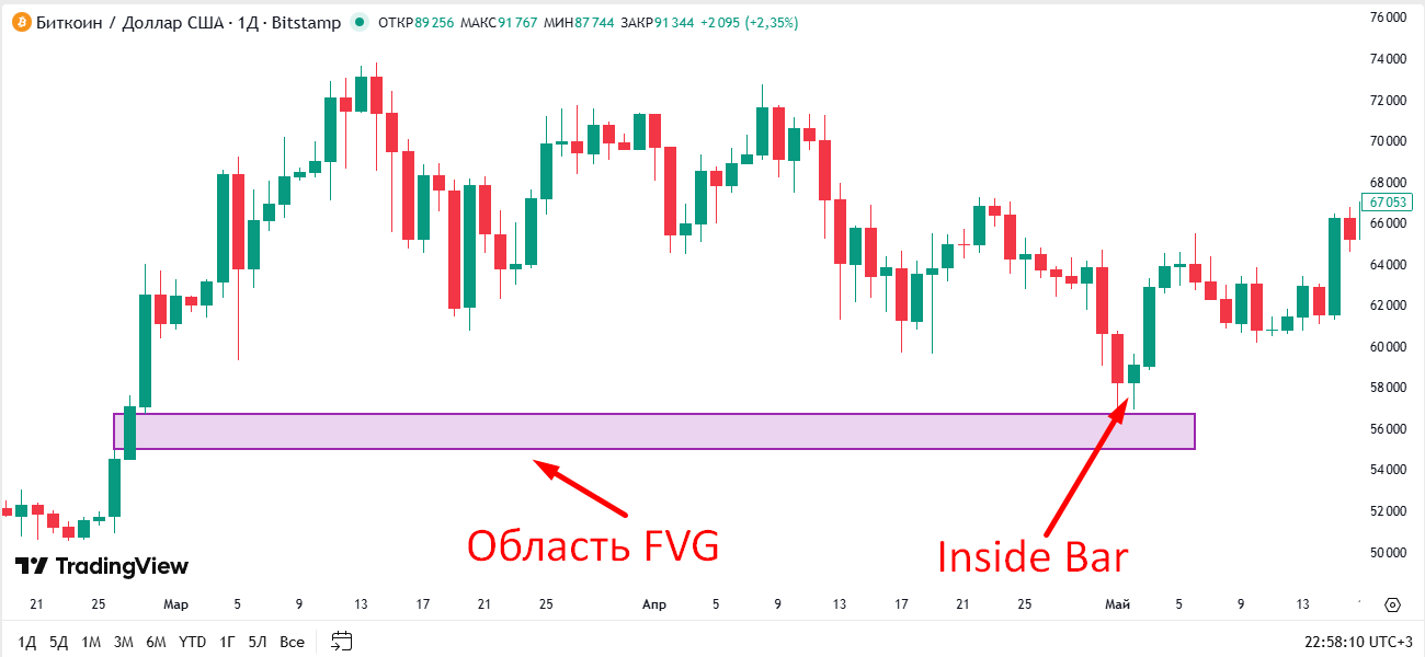 Такие сочетания помогают не просто увидеть момент равновесия, но и понять, в каком направлении действуют “умные деньги”. Если, например, внутри FVG или Order Block появляется Inside Bar, это может быть точкой входа в сделку по направлению крупных игроков.