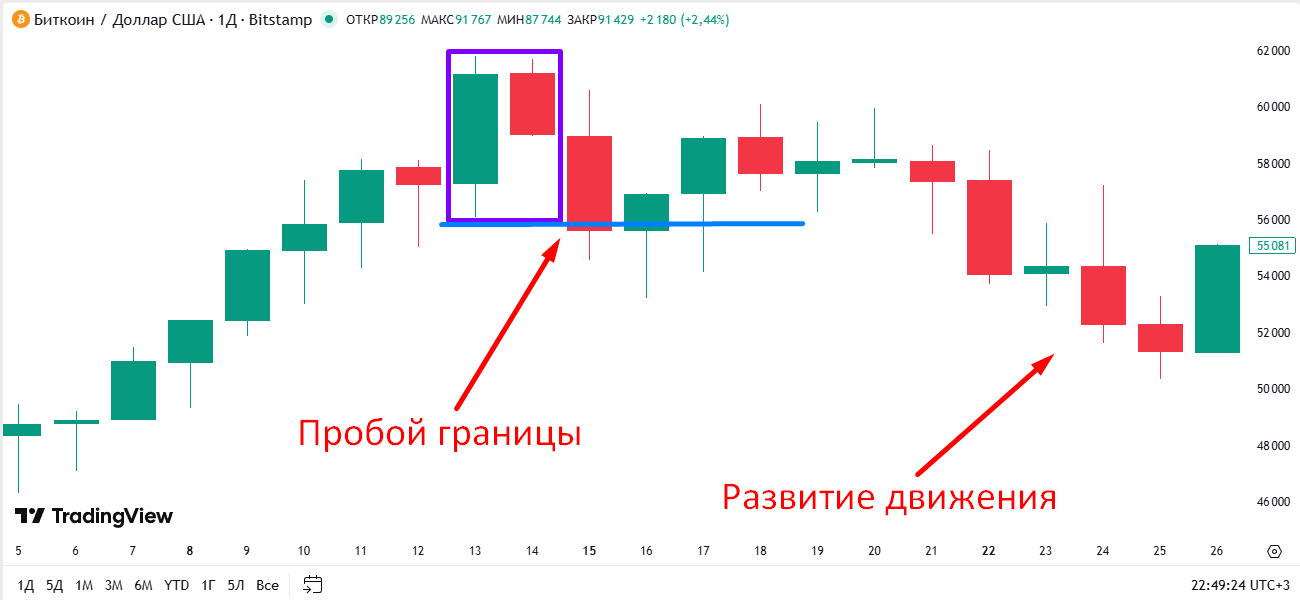 - Ложные пробои. После периода консолидации рынок часто “выбивает” ордера за пределы диапазона, а затем возвращается обратно. Без подтверждения объемом такой пробой может оказаться ловушкой.