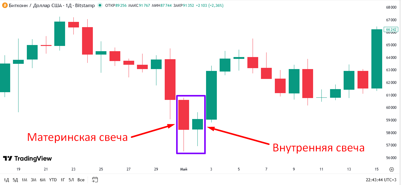 - Простоту распознавания. Паттерн не требует сложных вычислений, вам достаточно заметить свечу, полностью находящуюся внутри диапазона предыдущей.