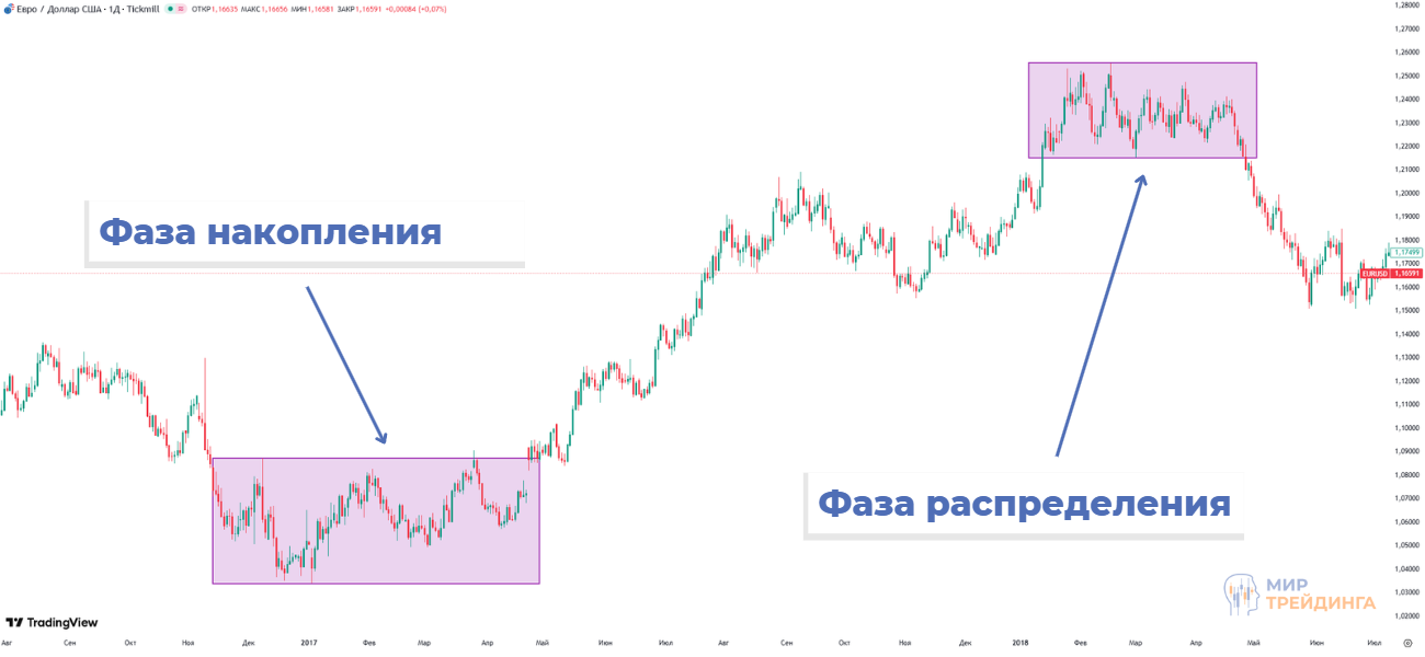 Институционалы не входят в рынок единым ордером. Их капитал настолько велик, что приходится распределять вход в рынок на недели и даже месяцы. Они инвестируют капитал постепенно, чтобы не спровоцировать резкое изменение цены. Этот процесс известен как аккумуляция и дистрибуция – периоды, когда крупные игроки собирают позиции перед ростом или выходят перед падением. На графике это можно увидеть как зоны консолидации – диапазоны, где Smart Money готовят будущий импульс.
