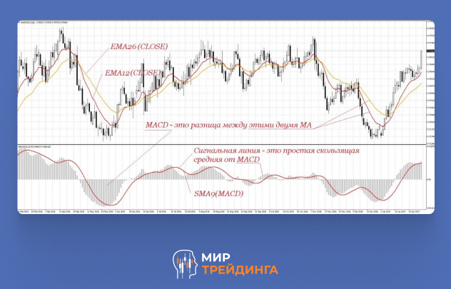 MACD (Moving Average Convergence Divergence) — трендово-импульсный индикатор, включающий в себя три элемента: MACD-линию, сигнальную линию и гистограмму.