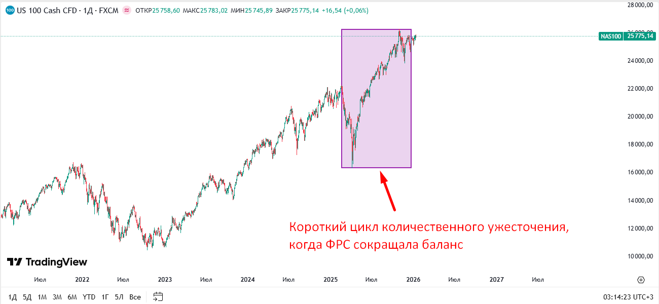 Одно из ключевых противоречий рыночной логики заключается в том, что слабые макроданные иногда вызывают рост котировок. Причина заключается в ожиданиях смягчения денежно-кредитной политики. Когда экономика замедляется, инвесторы начинают рассчитывать, что центробанк снизит ставки или запустит стимулы, что увеличит ликвидность и поддержит цены активов.