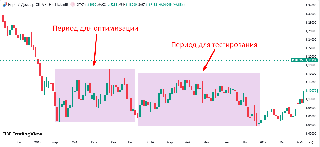 Чтобы результаты были объективными, тестовую и обучающую выборки нужно разделять. Оптимизация должна проводиться на одной части данных, а проверка на другой. Такой подход позволяет оценить, насколько стратегия жизнеспособна в реальных условиях, а не только в рамках исторического сценария. На картинке выше можно увидеть два похожих участка графика. Оптимизация и подгонка параметров осуществляется на первом участке, а тестирование на втором. В этом случае результаты будут актуальными.